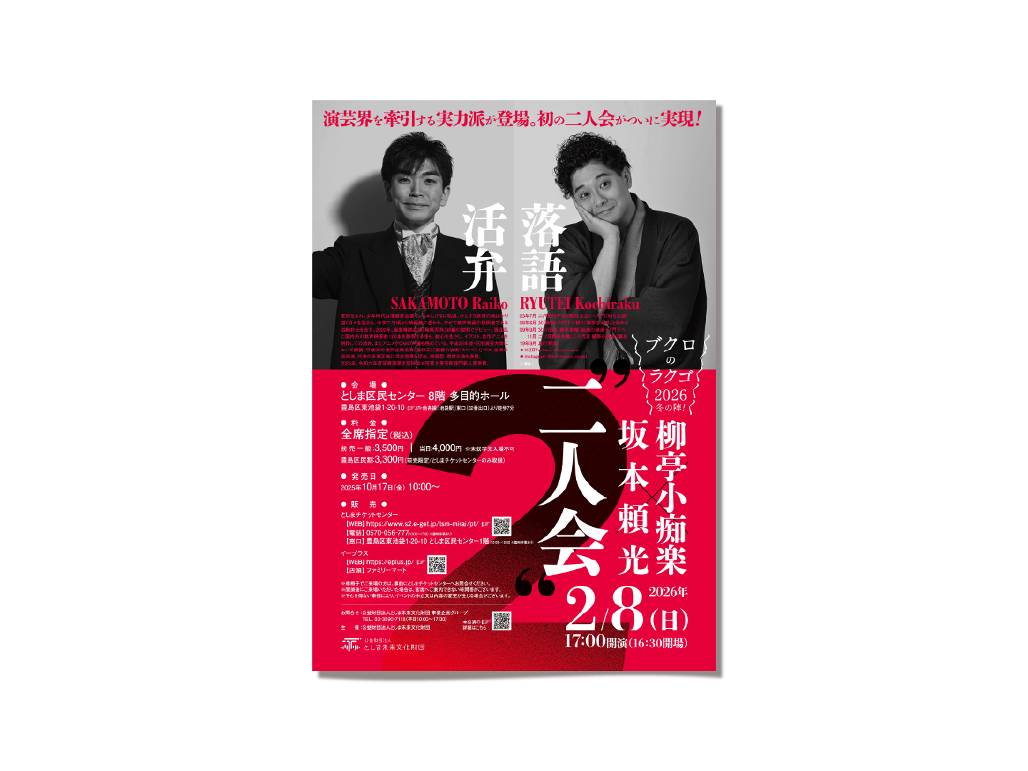 柳亭小痴楽×坂本頼光 二人会 広報物 2025.11.04としま区民センターで2026年2月8日に開催される、 ブクロのラクゴ2026冬の陣!「柳亭小痴楽×坂本頼光 二人会」の広報物を担当しました。 チケットはとしまチケットセンター、イープラスで販売中です。